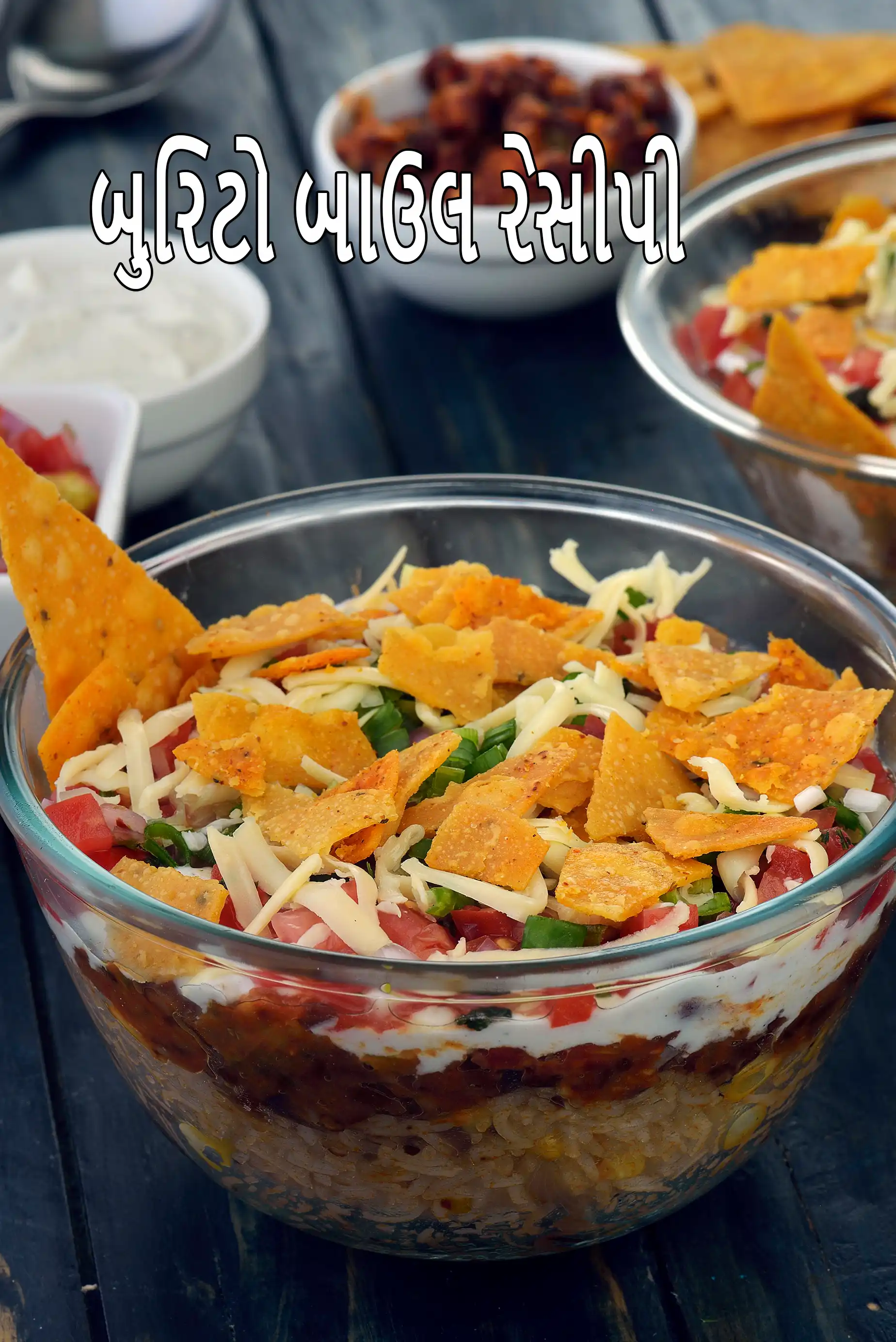 અહીં, ભાતને રંગબેરંગી શાકભાજી અને લસણ અને કાશ્મીરી લાલ મરચાંના ખાસ મિશ્રણના યોગ્ય મસાલાથી વધુ સ્વાદિષ્ટ બનાવવામાં આવે છે. તે રિફ્રાઇડ બીન્સ, સાઉર ક્રીમ અને રાંધ્યા વગરના સાલસા થી સ્તરિત છે; અને છેલ્લે ચીઝ અને અન્ય ઘટકોથી સજાવવામાં આવે છે; પીસેલી નાચો ચીપ્સ સાથે ટોપિંગ કરવામાં આવે છે, જેથી સંપૂર્ણપણે અપ્રતિરોધ્ય વન-ડિશ મીલ - મેક્સીકન બુરિટો બાઉલ બને છે.