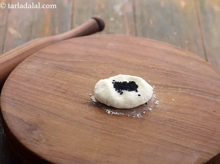 - Press a portion of the dough, flat on a rolling board and sprinkle ½ tsp of black sesame seeds over it. Roll out into an oblong of 125 mm. (5") using a little plain flour for rolling.