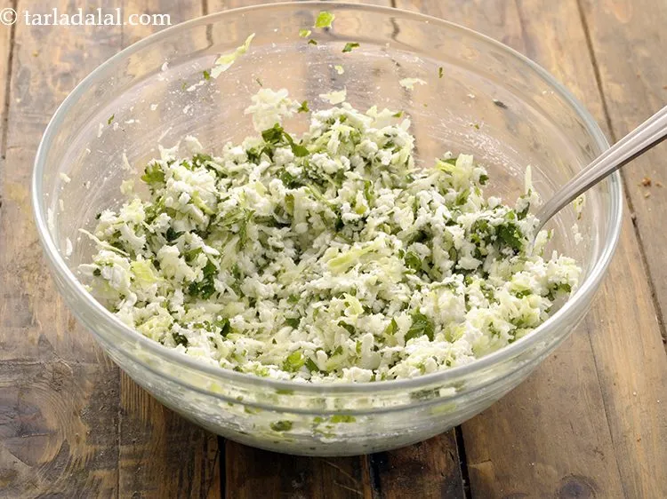 - गोभी पनीर ग्रील्ड सैंडविच बनाने के लिए, एक गहरी कटोरी में पत्तागोभी, पनीर, धनिया, हरी मिर्च और नमक डालें और अच्छी तरह से मिलाएं।