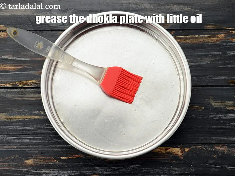 To make cabbage dhokla recipe | patta gobi dhokla | Indian gobi ka dhokla | quick healthy snack for steaming, grease the dhokla plate with little oil and even put water for steaming in a steamer.