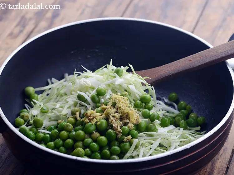 - Add the cabbage, green peas, ginger and salt, mix well and cook on a medium flame for 2 to 3 minutes, while stirring once or twice in between.