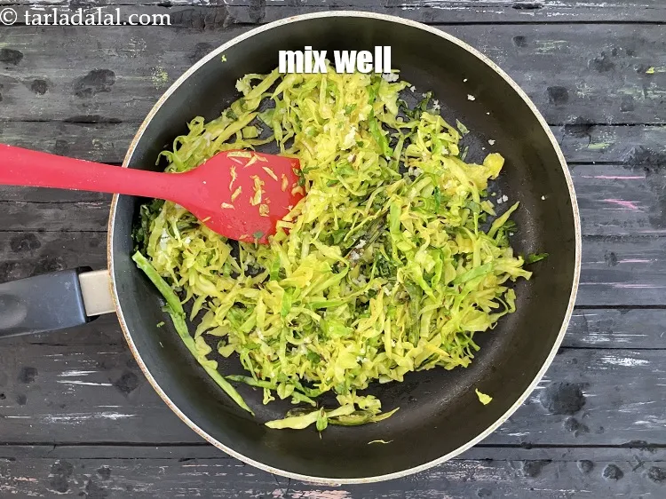 - Add the cabbage, turmeric powder and salt, mix well and cook on a medium flame for 2 to 3 minutes, while stirring occasionally.
