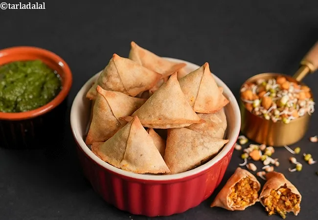 baked mixed sprouts samosa recipe | healthy baked samosa with mixed sprouts | baked samosa with mixed sprouts filling |