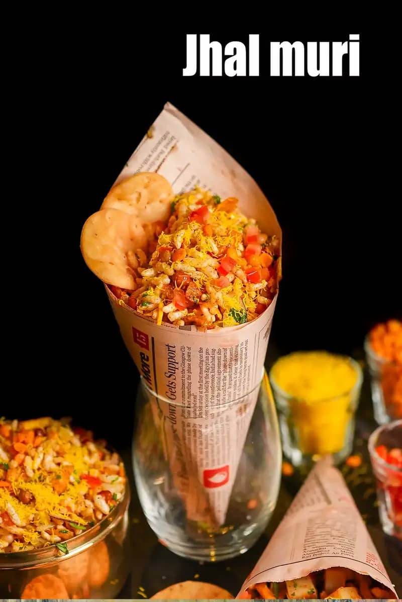 jhalmuri is a popular street snack popular in Calcutta made of puffed rice and an assortment of spices, sprouts, vegetables, chanachur and mustard oil. It is prepped up using a special bhaja masala or jhal muri masala.