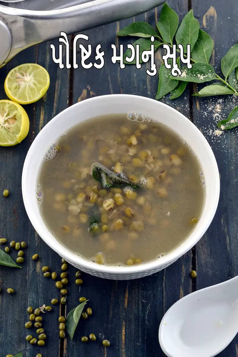 હા, આ સૂપ સ્વાસ્થ્યપ્રદ (healthy) છે. તે મુખ્યત્વે મગ (moong), જીરું (cumin seeds), મીઠા લીમડાના પાન (curry leaves)માંથી બને છે અને કોથમીર (coriander) વડે શણગારવામાં આવે છે.