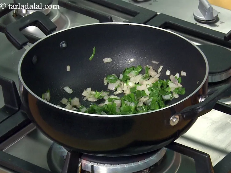- Heat the butter in a deep non-stick kadhai, add the finely chopped onions and sauté on a medium flame for 1 to 2 minutes.