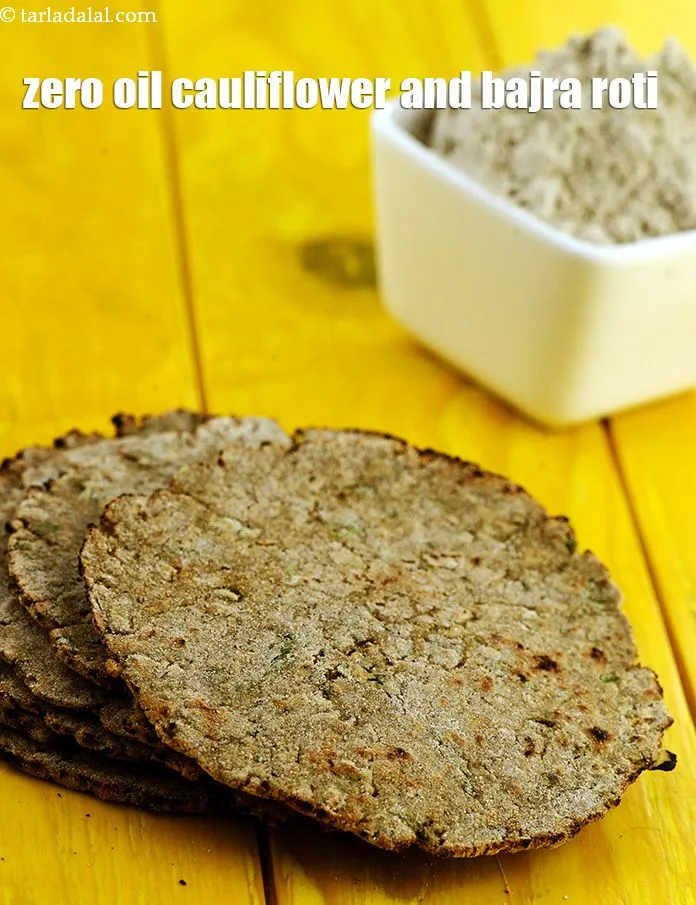 To make zero oil cauliflower and bajra roti the ingredients are the same as abve except there will be not oil used. bajra gobi paratha is made from 1/2 cup bajra (black millet) flour, 3/4 cup grated cauliflower, 1 1/2 tbsp finely chopped spring onions whites, 1 1/2 tbsp finely chopped spring onion greens, 2 tbsp finely chopped coriander (dhania), 1/2 tsp ginger-green chilli paste, 1/2 tsp grated garlic (lehsun) and salt to taste.