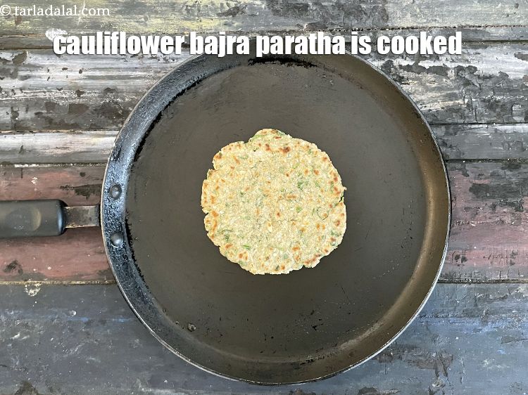 Tips for cauliflower and bajra roti. 1. Use a spatula to press down on the paratha to cook it evenly. 2. You can cook 2 rotis at one time on the tava. 3. To grate cauliflower, wash and clean the cauliflower thoroughly. Grate the cauliflower by holding the whole cauliflower with the stem against the thickest holes of a grater and grate it by pushing it downwards using the force of your hands. The florets should quickly crumble away to rather fine bits, leaving you with the tougher stem.