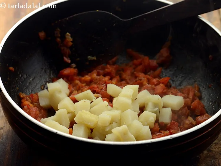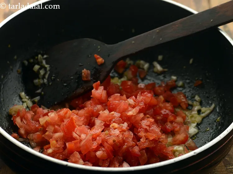 - Add the tomatoes, chilli powder, garam masala and chaat masala, mix well and sauté on a medium flame for another 2 to 3 minutes.