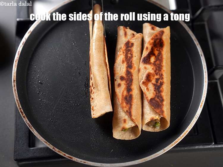 - Heat a non stick tava and grease it using 1/2 tsp oil and place few rolls at a time and cook on medium flame for 2 minutes till golden brown from all the sides, using little oil for cooking.