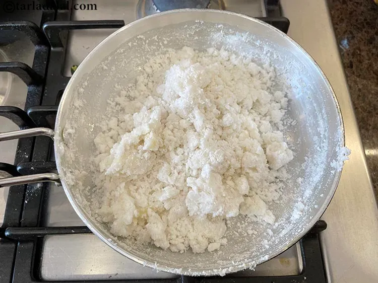 Once the water boils, add the rice flour. This step is important to make the dough of rice flour bhakri and also make rolling easier as rice flour is devoid of gluten.