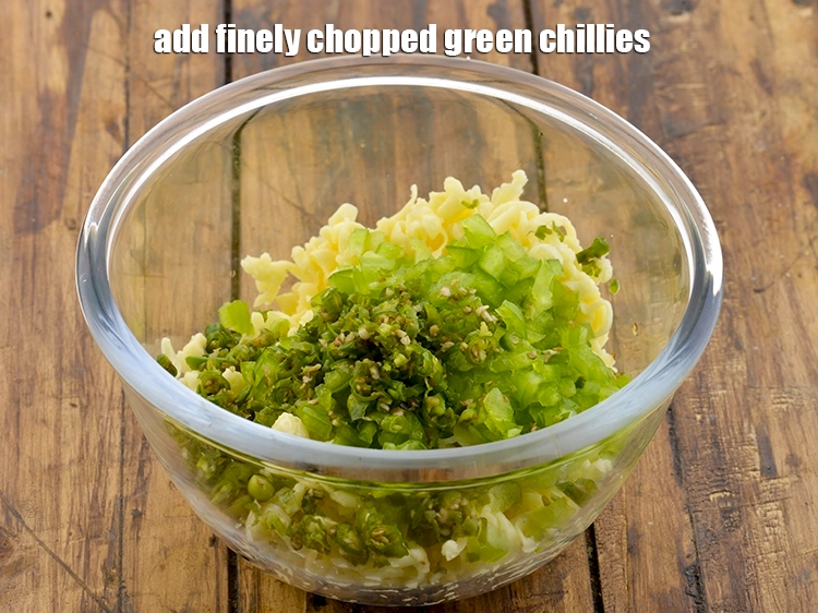 - To make chilli cheese toast, combine the cheese, capsicum, green chillies and salt in a deep bowl and mix well.