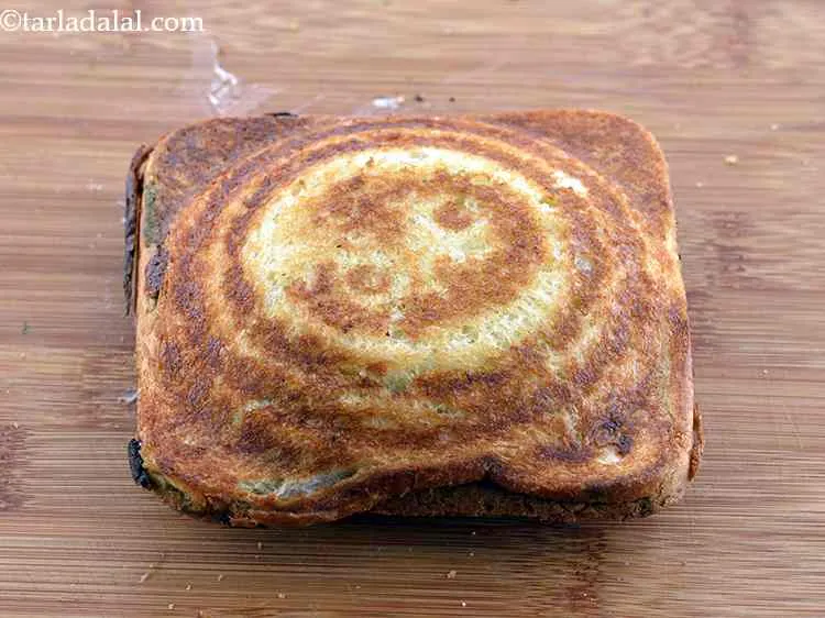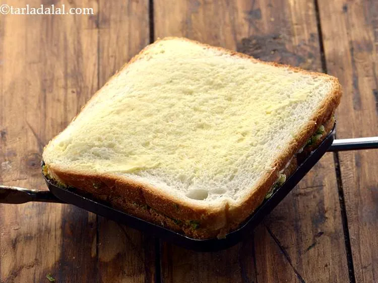 - Place the sandwich in the sandwich toaster and cook on a medium flame, till it turns brown and crisp from both the sides.