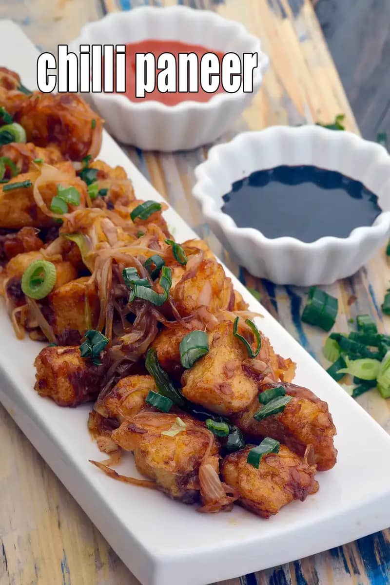 बैटर-कोटेड और डीप-फ्राइड पनीर क्यूब्स को हरी मिर्च और स्प्रिंग प्याज के साथ फेंक दिया जाता है ताकि यह वास्तव में शानदार चिल्ली पनीर ट्रीट किया जा सके जिसे स्टार्टर के रूप में या मुख्य पाठ्यक्रम के लिए संगत के रूप में परोसा जा सकता है।