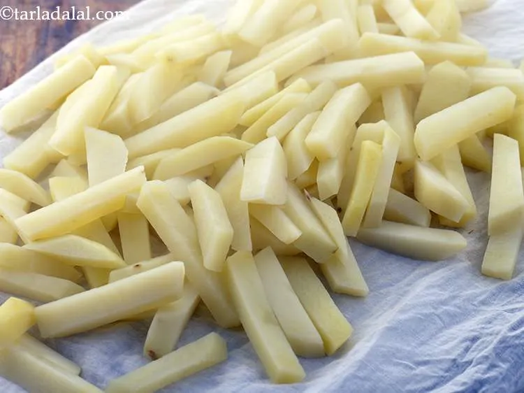 ऑक्सीकरण को रोकने के लिए उन्हें पानी में डूबा के रखें। आलू फिंगर को समान रूप से काटना महत्वपूर्ण है ताकि वे समान रूप से पक जाए।