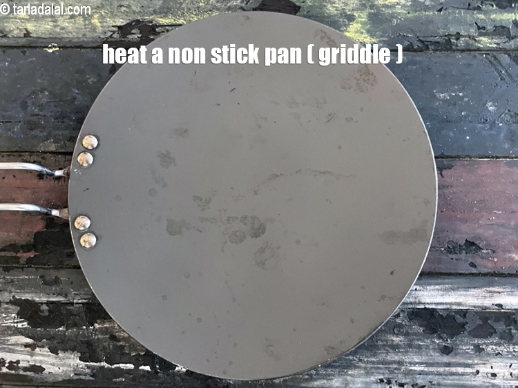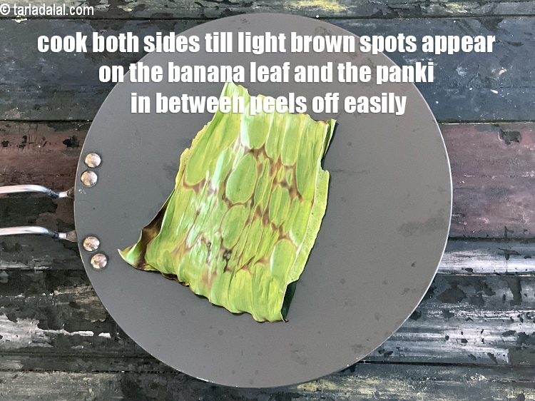 - Heat a non-stick tava (griddle) and cook the panki on both sides till light brown spots appear on the banana leaves and the panki in-between peels off the banana leaves easily.