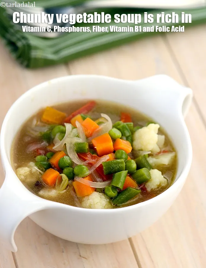 chunky vegetable soup is rich in Calcium phosphorus, dietry fibre, and vitamin B1.