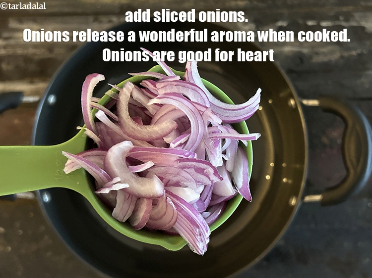 Sauté on a medium flame for 2 to 3 minutes or till the onions turn brown in colour.