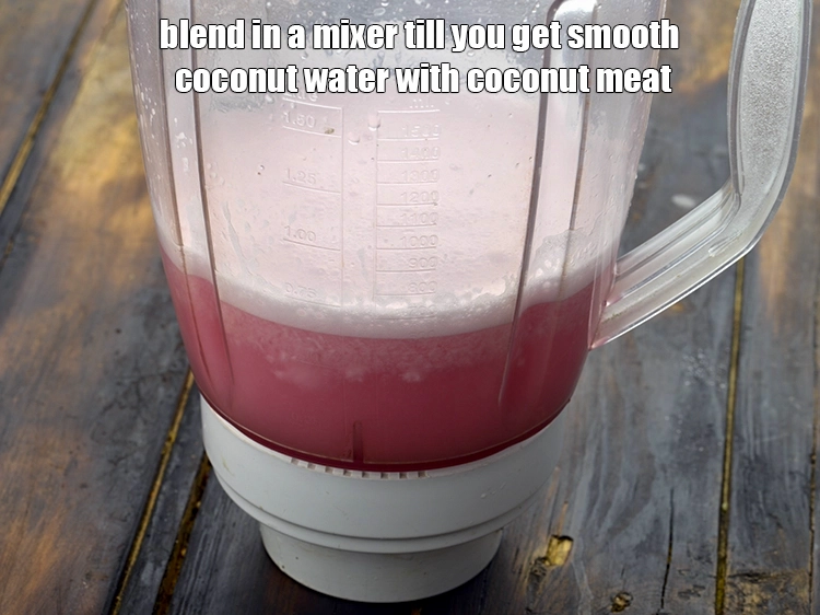 8. Add the 2 drops kewra essence, 2 tbsp. rose syrup and blend in a mixer till you get smooth coconut water with coconut meat.