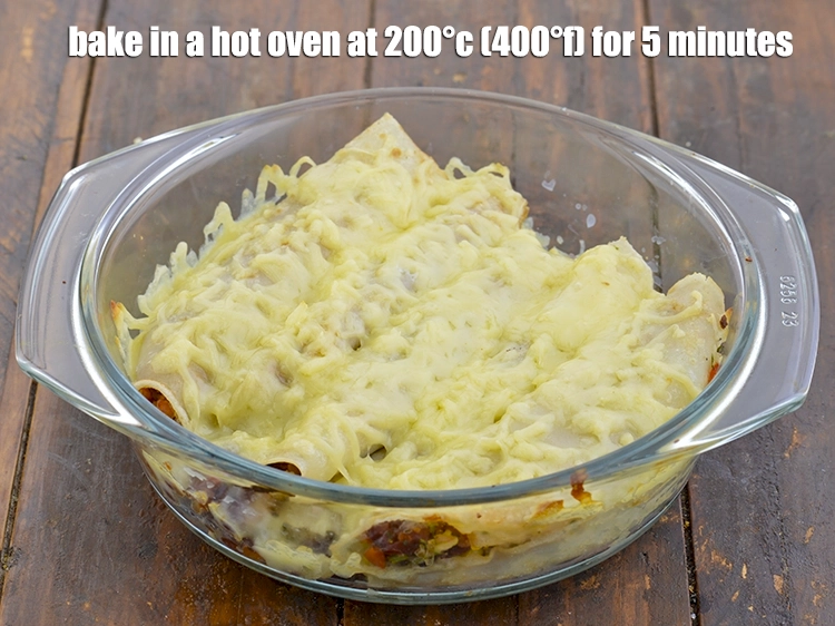- Sprinkle the cheese on top and bake in a hot oven at 200°c (400°f) for 5 minutes.
