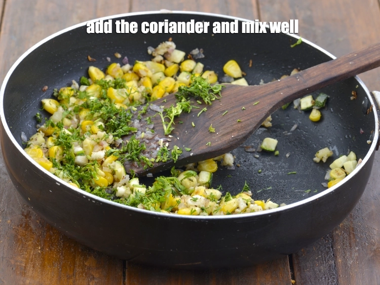 - Switch off the flame, add the coriander and mix well. Divide the mixture into 5 equal portions and keep aside.