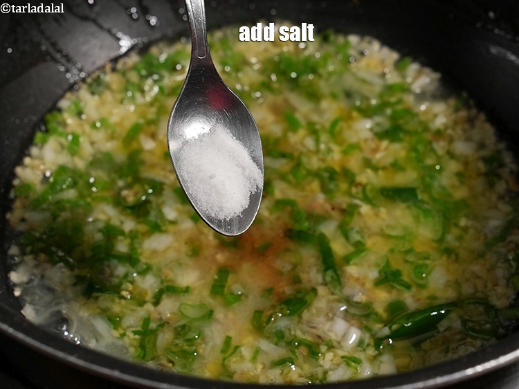 - Add the spring onions, soya sauce and salt and sauté on a high flame for 1 minute.