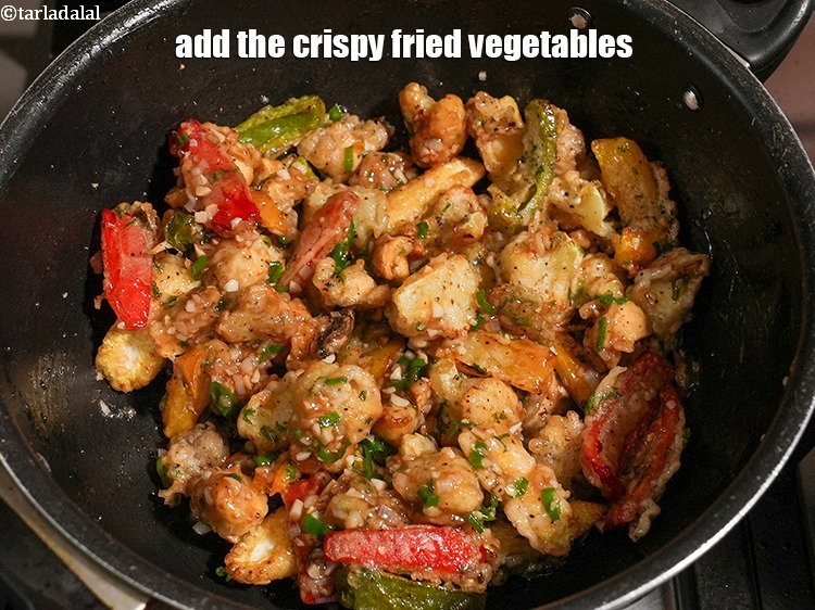 - Add the crispy fried vegetables, toss gently and cook on a high flame for 1 minute, while tossing occasionally.