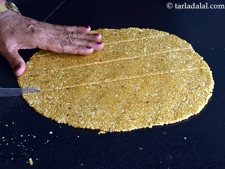 Cut immediately using a sharp knife into equal square pieces. Make the cut marks of desired shape on the chikki, while it is yet hot. After cooling, it is difficult to break it into pieces of desired shape. Finally cool it completely.