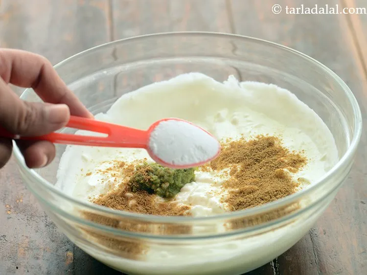 3. Add the green chilli paste, cumin seeds powder, powdered sugar and salt and mix well.