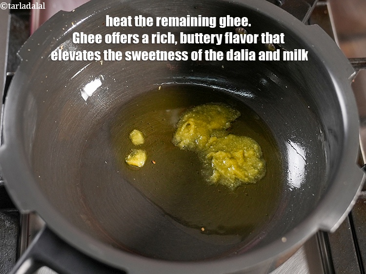 Heat the remaining ghee. Ghee offers a rich, buttery flavor that elevates the sweetness of the dalia and milk.
