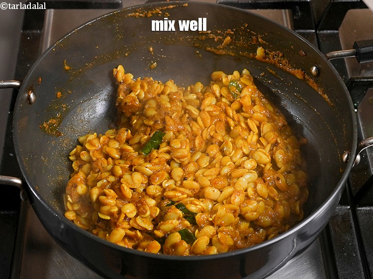 - Mix well and cook on a medium flame for 2 to 3 minutes, until the raw smell of vaal goes off.