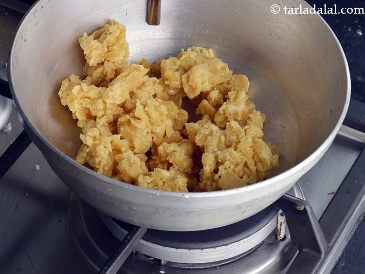 - Add the jaggery, mix well and cook on a high flame for 2 minutes, while stirring continuously.