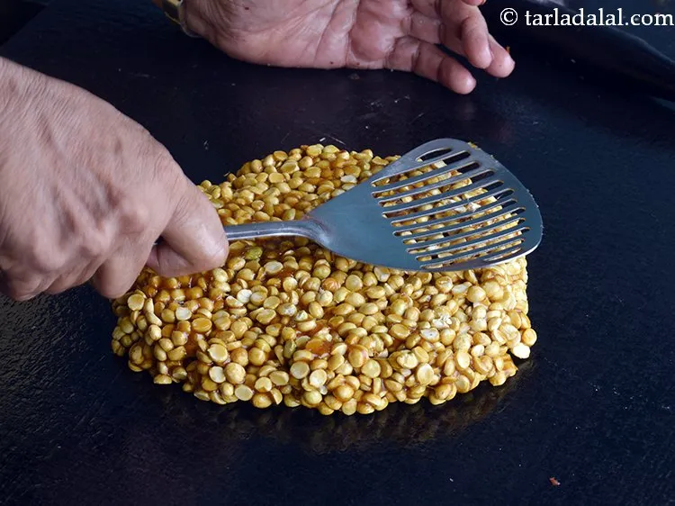 Cut immediately using a sharp knife into equal square pieces. Make the cut marks of desired shape on the chikki, while it is yet hot. After cooling, it is difficult to break it into pieces of desired shape. Finally cool it completely.