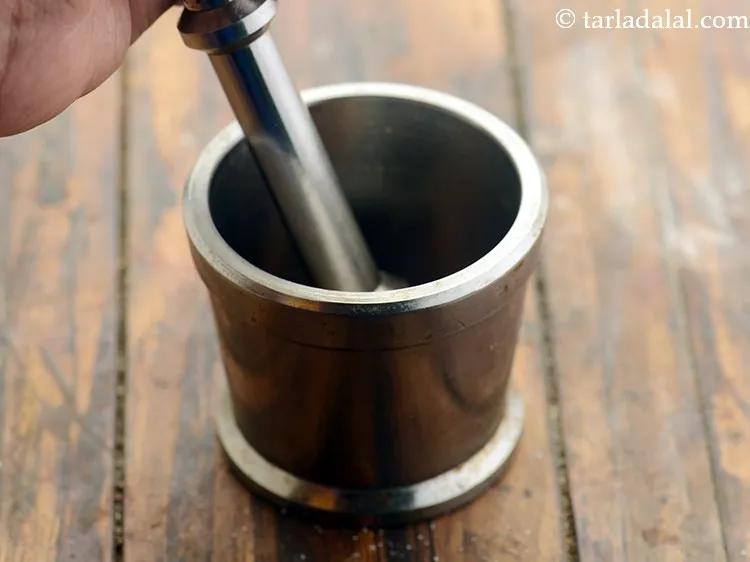 - Combine all the ingredients in a mortal pestle (khalbatta) and pound till coarse. Keep aside.