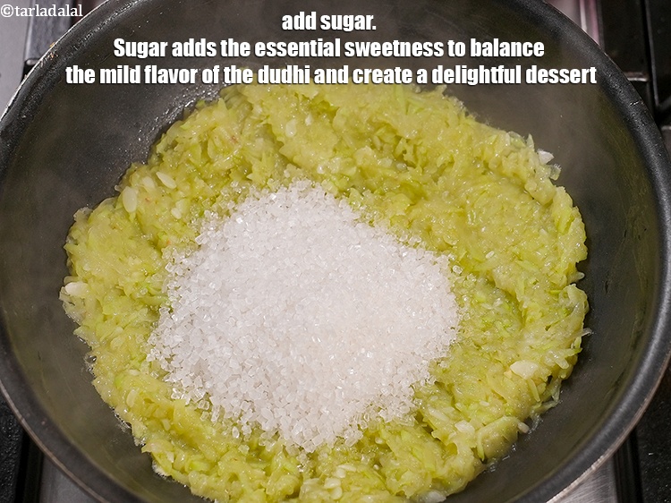 Add ½ cup sugar. Sugar adds the essential sweetness to balance the mild flavor of the dudhi and create a delightful dessert.