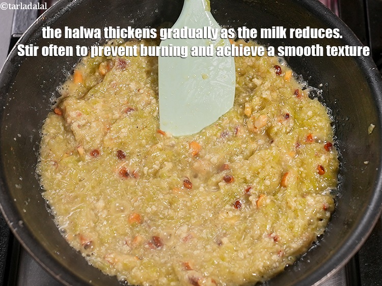 The halwa thickens gradually as the milk reduces. Stir often to prevent burning and achieve a smooth texture.