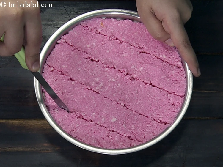 - रोज बर्फी बनाने के लिए, लाल रंग छोड़कर, सभी सामग्री को एक गहरे बाउल में डालकर अच्छी तरह मिला लें।