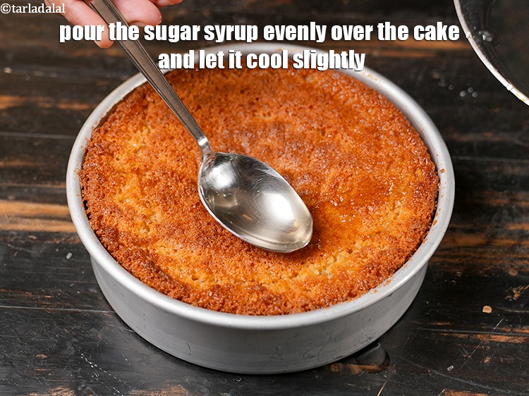 - Remove and allow it to cool slightly. Pour the sugar syrup evenly over the cake and let it cool slightly.