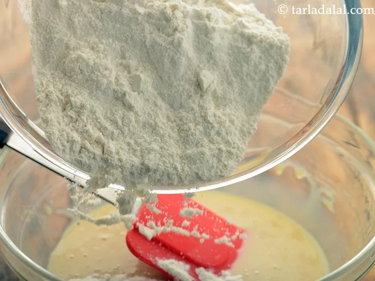- Sieve the plain flour, baking powder and baking soda in a deep bowl, mix well and keep aside.