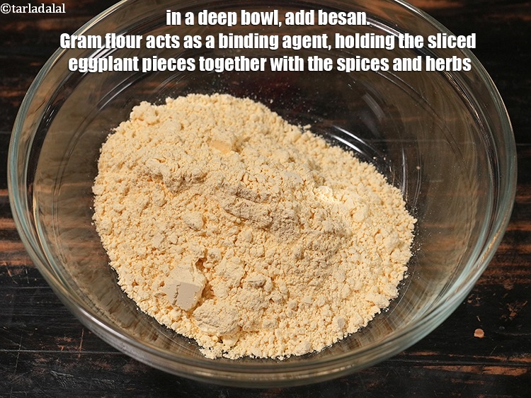 In a deep bowl, add 1 cup besan (bengal gram flour). Gram flour acts as a binding agent, holding the sliced eggplant pieces together with the spices and herbs.