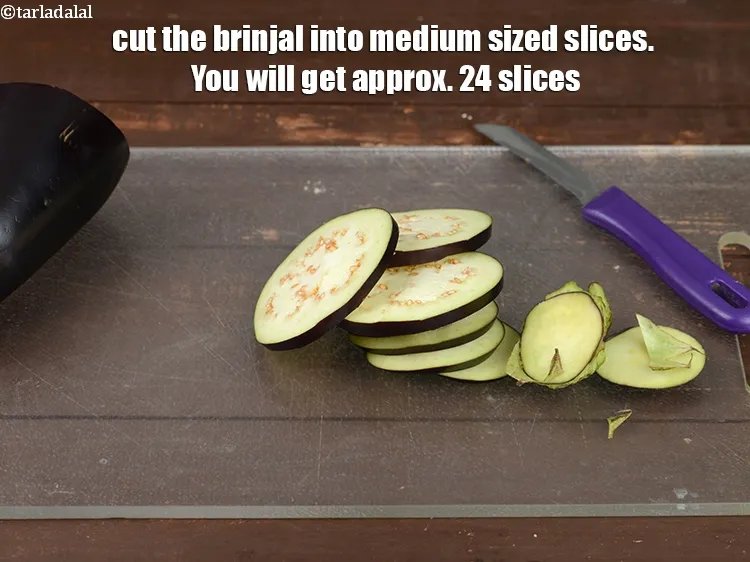 Trim both the edges of the brinjal and cut into medium sized slices. You will get approx. 24 slices.