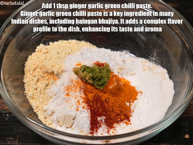 Add 1 tbsp ginger (adrak) garlic (lehsun) green chilli paste. Ginger garlic green chilli paste is a key ingredient in many Indian dishes, including baingan bhajiya. It adds a complex flavor profile to the dish, enhancing its taste and aroma.