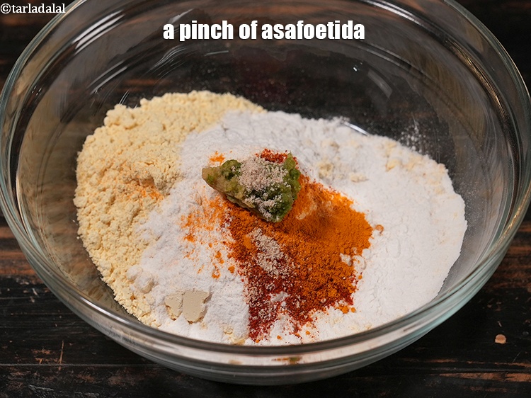 Add ¼ tsp turmeric powder (haldi). Turmeric powder is a natural yellow-orange colorant that gives the bhajiya a vibrant and appetizing hue.