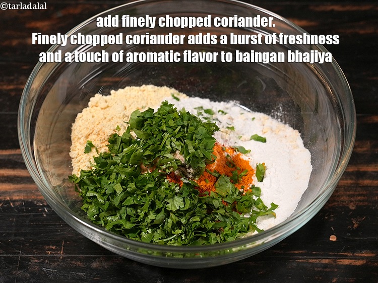 Add 2 tbsp finely chopped coriander (dhania). Finely chopped coriander adds a burst of freshness and a touch of aromatic flavor to baingan bhajiya.