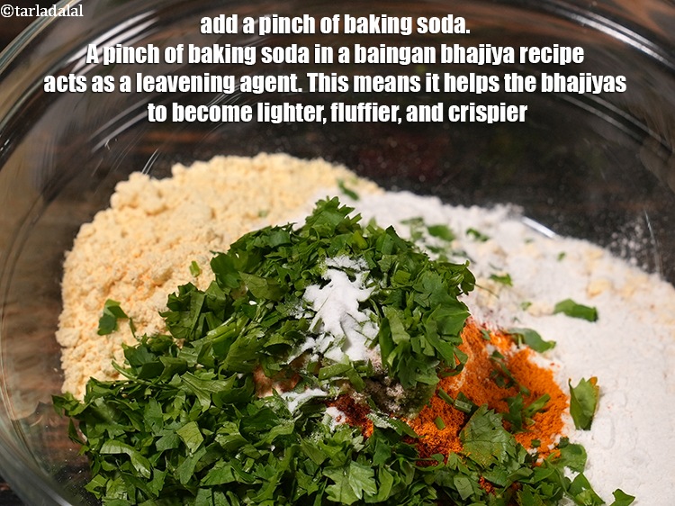 Add a pinches of baking soda. A pinch of baking soda in a baingan bhajiya recipe acts as a leavening agent. This means it helps the bhajiyas to become lighter, fluffier, and crispier.