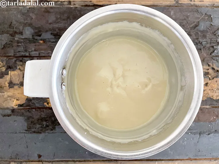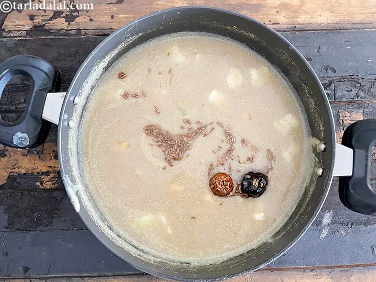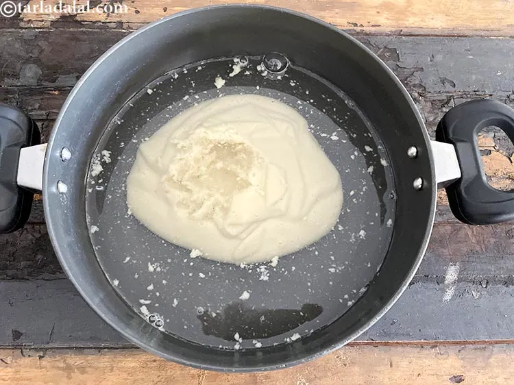 - Transfer it to a deep non-stick pan, add 4 cups of water, mix well and simmer for 7 to 8 minutes, while stirring once in between.