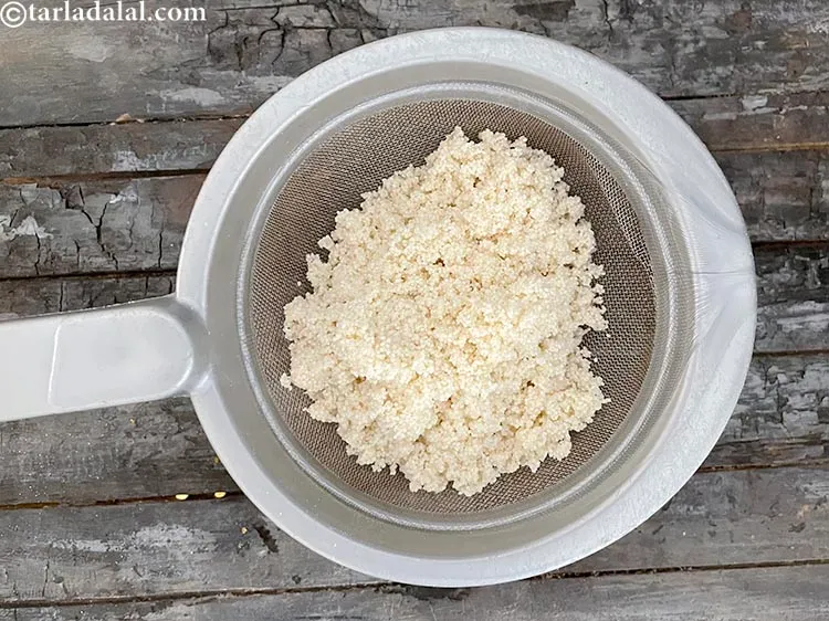 - Drain, add the curds, 2 tsp of ginger-green chilli paste, rock salt and mix well.
