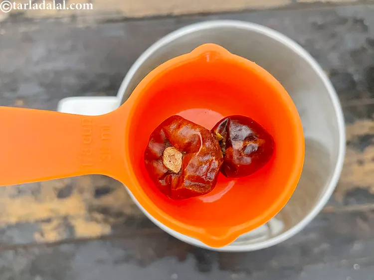- When the seeds crackle, add the remaining 2 round red chillies and sauté for a few seconds.