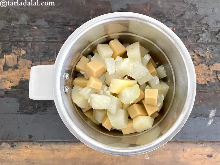 - Boil a vesselful of water, add 1 cup of bottle gourd, 1 cup of yam and potatoes and cook for 8 to 10 minutes or till the vegetables are completely cooked.