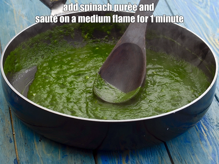 - Add the spinach purèe and sauté on a medium flame for 1 minute.